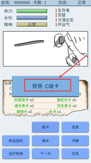 3、抽卡后可能獲得【C級卡】等低級卡,若有【水卡】優先使用補充水分,確保生命值在一半以上避免生存危機。