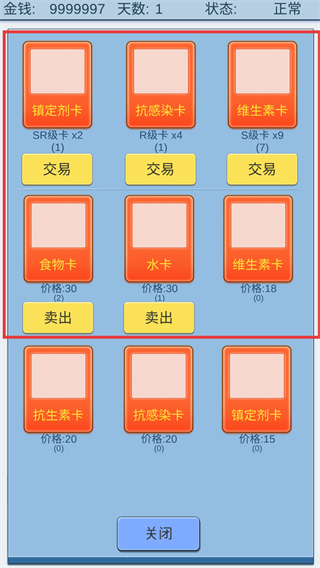 4、進入【交易】界面關注卡片價格,賣出多余【食物卡】【水卡】換金錢,或交易稀缺資源優化配置助力通關。