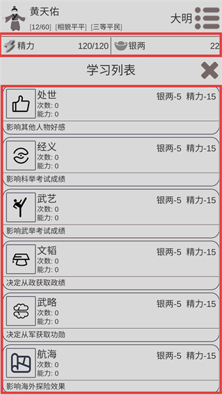4、優先選擇學習處世,消耗少量銀兩和精力,提升處世能力以影響其他人物好感。