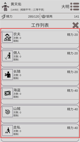 2、利用無(wú)限體力選【農(nóng)夫】,工作穩(wěn)定積累銀兩為參加武舉等活動(dòng)儲(chǔ)備資金推進(jìn)進(jìn)程。