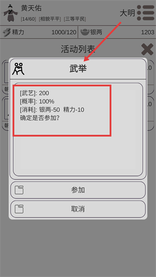 3、武藝達(dá)200參加【武舉】消耗50銀兩10體力,100%通過(guò)可快速晉升官職積累權(quán)勢(shì)。