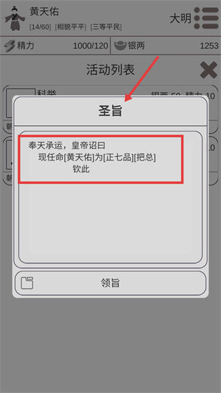 4、獲【圣旨】任【正七品】【把總】后,履行職責(zé)積累聲望為后續(xù)更高官職晉升做準(zhǔn)備。