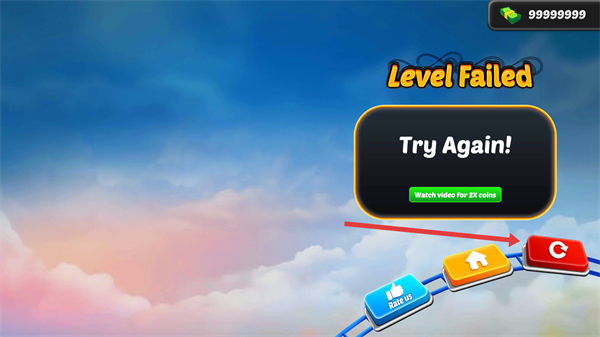 4、若關卡失敗(顯示“LevelFailed”),點擊重置按鈕重新進入關卡,優化操作節奏以順利通關。