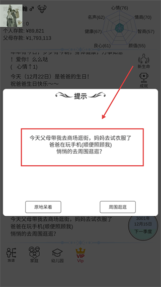 3、面對商場逛街事件,選擇【周圍逛逛】可觸發隱藏事件,提升心情或獲得額外屬性加成。