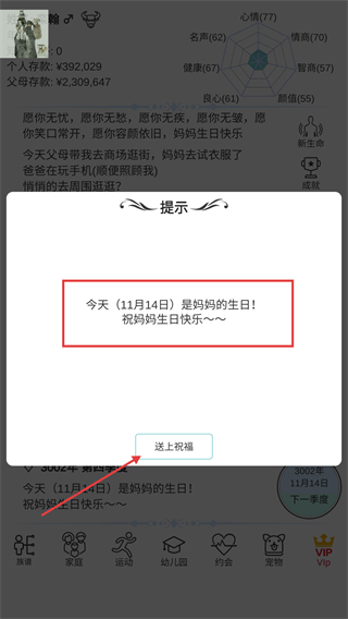 4、在媽媽生日時點擊【送上祝福】,可提升家庭親密度,增加角色【心情】等屬性數值。