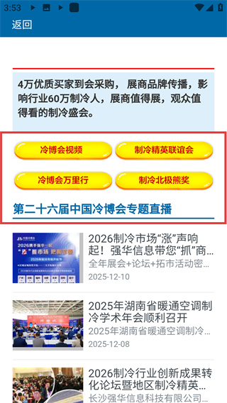 2、在【第二十六屆中國冷博會專題直播】詳情頁,點擊【冷博會視頻】按鈕,進入冷博會相關的視頻聚合頁面。
