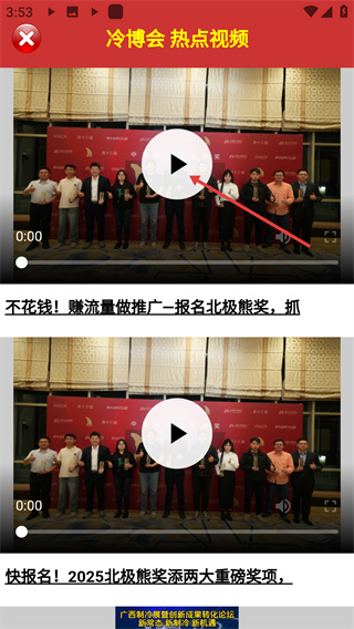 3、進入【冷博會熱點視頻】頁面后,點擊目標視頻上的播放按鈕,即可啟動該冷博會相關視頻的播放流程。