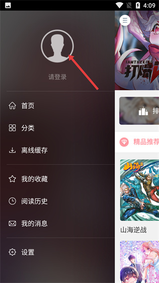 1、進入漫畫應用首頁,點擊左上角的菜單按鈕,打開側邊功能欄,可查看首頁、分類等各類功能入口。