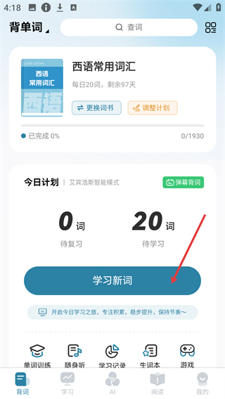 1、進入背單詞頁面,確認【西語常用詞匯】詞書的今日計劃,點擊【學習新詞】按鈕進入待學單詞列表。