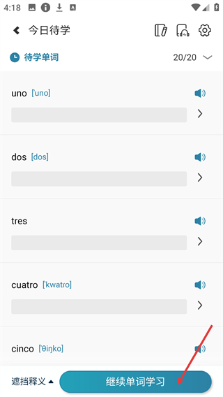 2、在今日待學頁面,點擊底部【繼續單詞學習】按鈕進入學習設置界面。