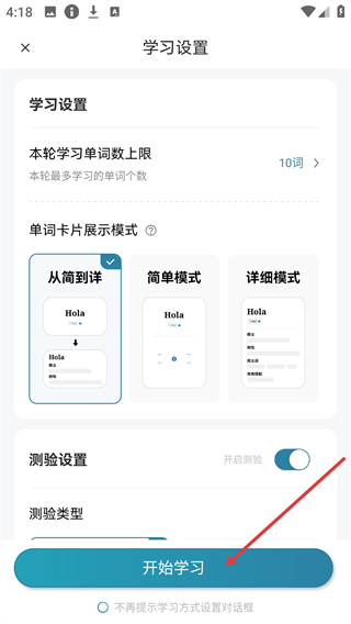 3、在學習設置頁面,選好卡片模式后點擊【開始學習】進入單詞學習界面。