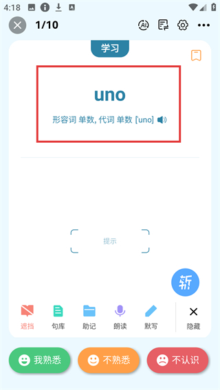 4、進入單詞學習頁面,查看【uno】的詞性與發音信息,可通過【我熟悉】等按鈕標記對該單詞的掌握程度。