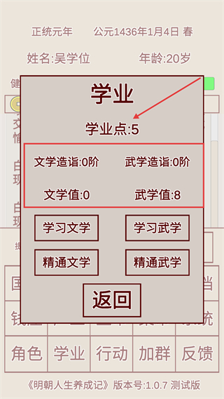 1、進入【學業】界面,消耗【學業點-5】選擇【學習文學】或【學習武學】,積累對應屬性值為后續鋪路。