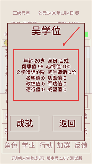 2、查看【角色】界面的【年齡-20歲】【身份-百姓】等數值,依據當前能力規劃提升名望的方向。