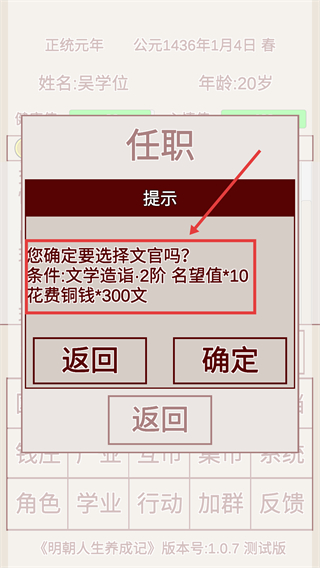 3、選擇【文官】任職前,需滿足【文學造詣-2階】【名望值-10】【銅錢-300文】,達標后點擊確定。