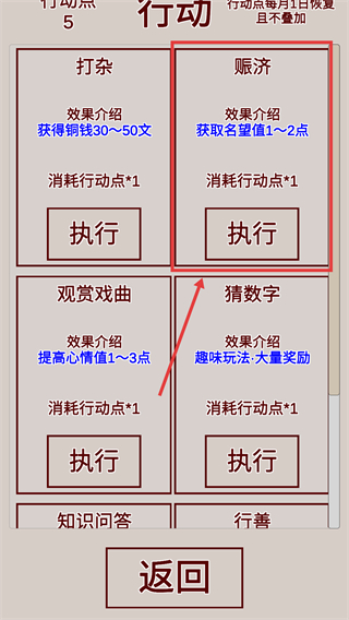 4、在【行動】界面執行【賑濟】,消耗【行動點-1】獲取【名望值-1~2點】,積累任職所需條件。