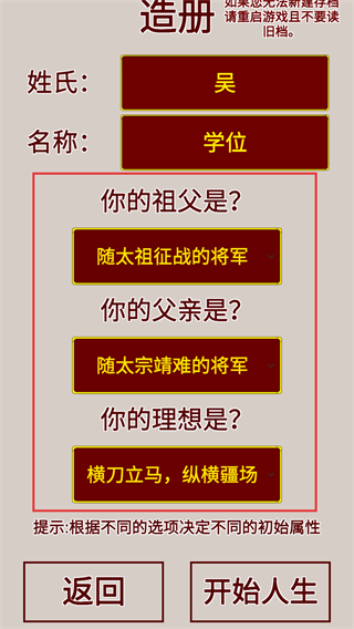 2、創建角色時選姓氏【吳】、名稱【學位】,定祖父【隨太祖征戰的將軍】、父親【隨太宗靖難的將軍】及理想影響初始屬性。