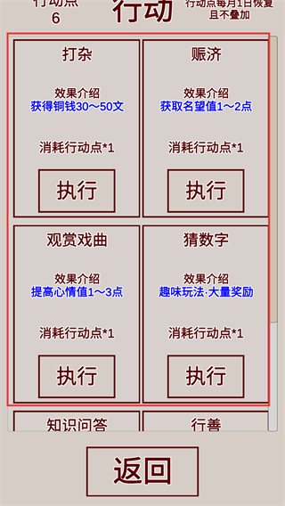 3、行動界面用行動點執行【打雜】獲銅錢30-50,或【賑濟】得名望1-2,也可選【觀賞戲曲】提心情或【猜數字】拿獎勵。