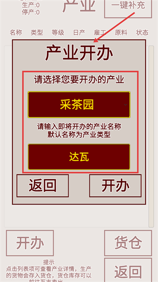 4、產業界面選【采茶園】,輸入名稱【達瓦】后點擊開辦,積累產業資源推進經商路線,體驗明朝模擬經營樂趣。