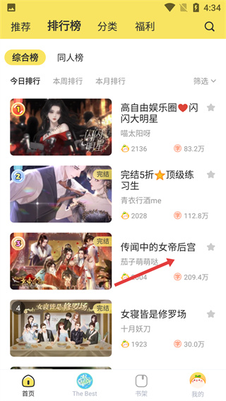 1、進入【排行榜】頁面的【綜合榜】分類,找到對應的作品,點擊進入該作品的詳情頁面。