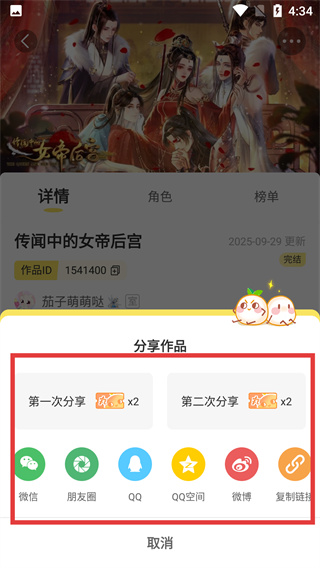 4、進入【分享作品】頁面后,可選擇微信、QQ等渠道完成分享,同時能獲取對應的分享獎勵。
