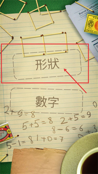 2、進入游戲后,選擇紅色框選的【形狀】分類,該分類下是火柴形狀相關的拼圖關卡,可由此開啟對應挑戰。