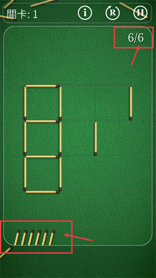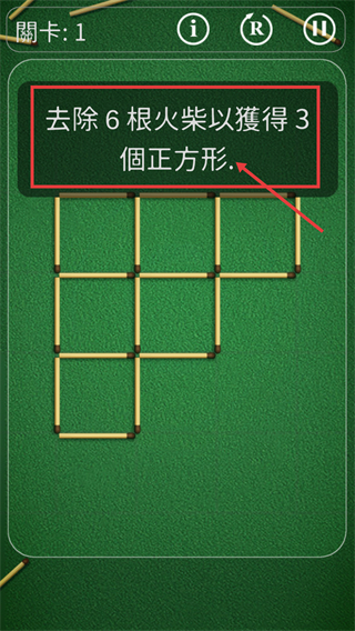 3、關卡1的提示為【去除6根火柴獲得3個正方形】,先明確該任務要求,再開始規劃要移除的火柴位置來達成目標。