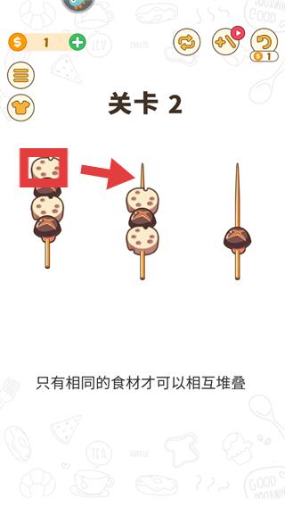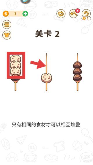 2、進入【關卡2】后,依據【只有相同的食材才可以相互堆疊】提示,移動紅色框選的相同食材至對應串上。