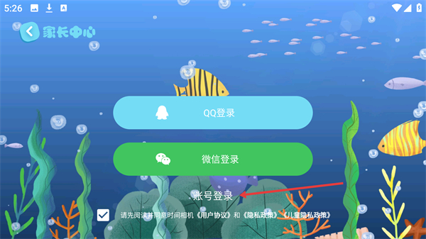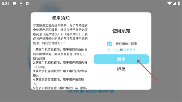 1、打開繪本故事后彈出【使用須知】彈窗,閱讀【用戶協議】與【隱私政策】,勾選同意后點擊【同意】按鈕進入家長中心界面。