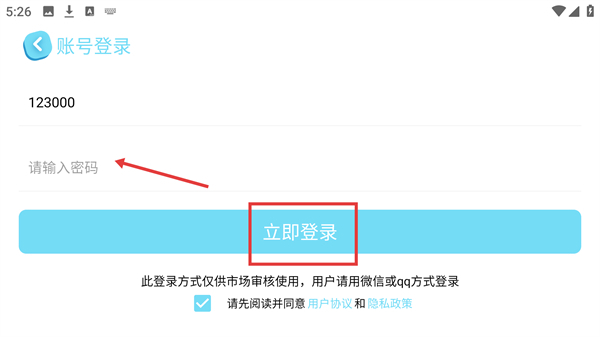 4、在【賬號登錄】頁面填好賬號后,點擊【請輸入密碼】輸入框填寫密碼,完成后點擊【立即登錄】按鈕提交登錄。