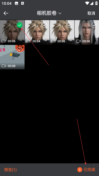 3、在相機膠卷頁,【選中視頻】后點擊【已完成】,進入視頻裁剪的編輯界面。