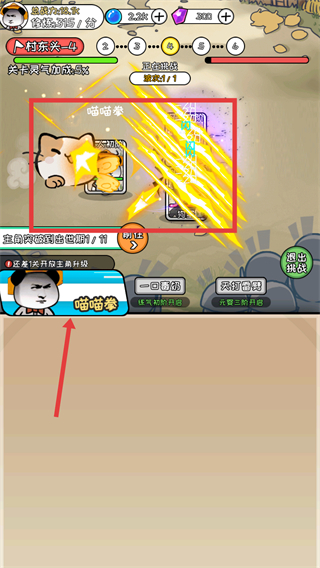 4、在【村東頭-5】處觸發對戰,操控角色釋放技能(如【喵喵拳】)攻擊敵方,推進關卡進度。
