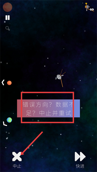 4、若出現“錯誤方向?中止并重試”的提示,點擊“中止”按鈕,重新進行發射瞄準的操作,直至完成本次航天飛行任務。
