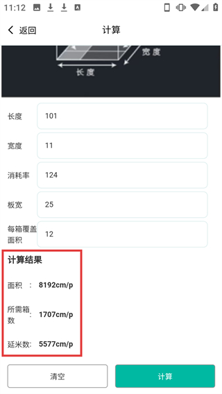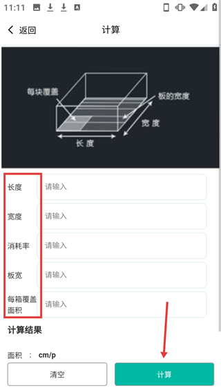 4、填寫完參數后點擊【計算】按鈕,獲取對應的面積、所需箱數等計算結果。