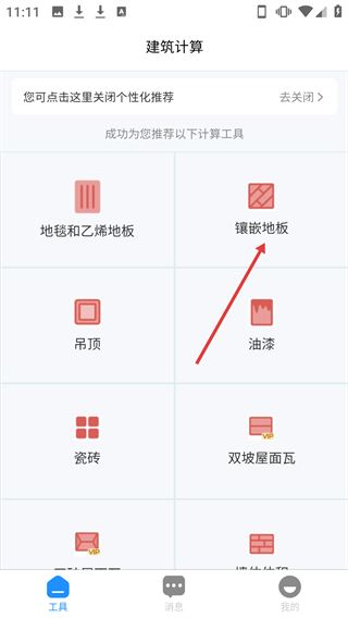 2、在建筑計算工具頁面點擊【鑲嵌地板】選項,進入該工具的計算頁面。