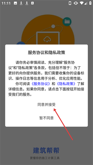 1、在【服務協議和隱私政策】彈窗中點擊【同意并接受】按鈕,進入建筑計算工具頁面。
