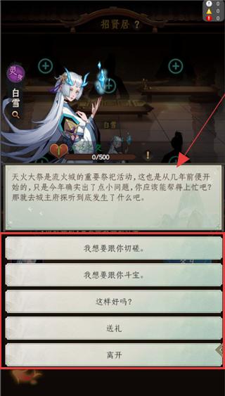 1、在【招賢居】與【白雪】交互,選擇合適的對話選項,可推進劇情或提升關聯,助力后續修仙進程。