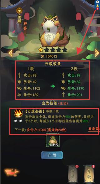2、升級【金蟾】神獸,提升攻擊防御等屬性,解鎖【萬道金雨】技能,增強戰斗輸出能力。