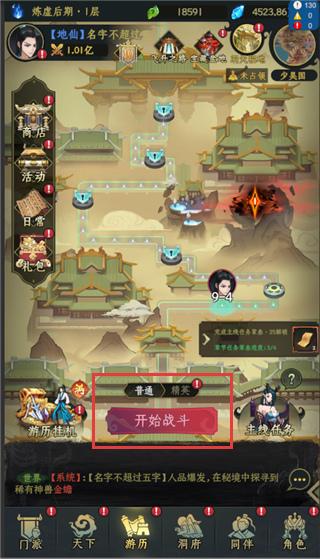 4、進入【煉虛后期·1層】,選【普通】或【精英】模式,點擊【開始戰斗】獲取修為資源。