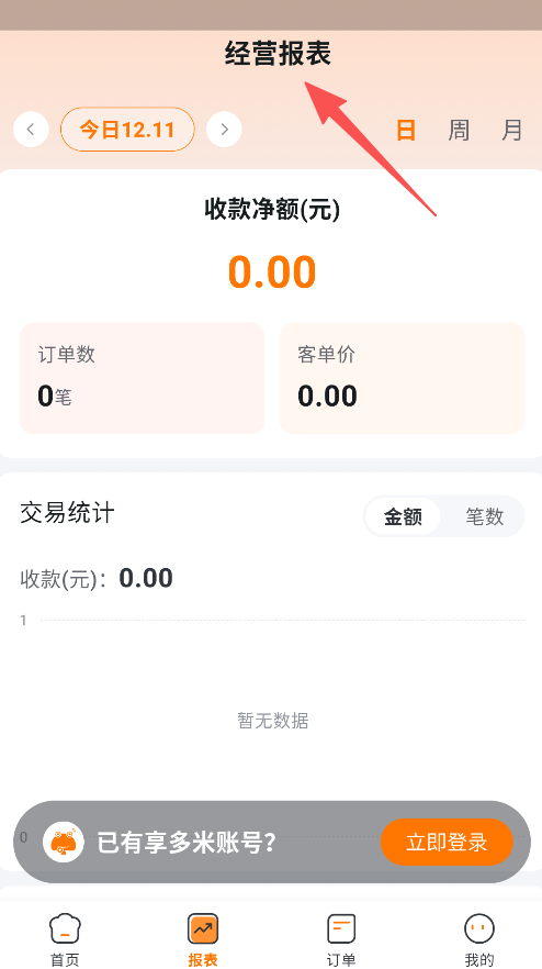 1、具備經營報表展示功能,在報表頁面查看收款凈額、訂單數、客單價等餐飲經營核心數據。