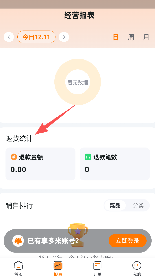 3、設有退款統計功能,在報表頁面查看退款金額、退款筆數等餐飲經營相關的退款信息。