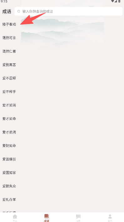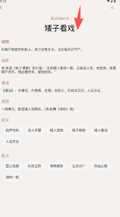 2、在“詞典”頁面的列表中點擊成語如“矮子看戲”。