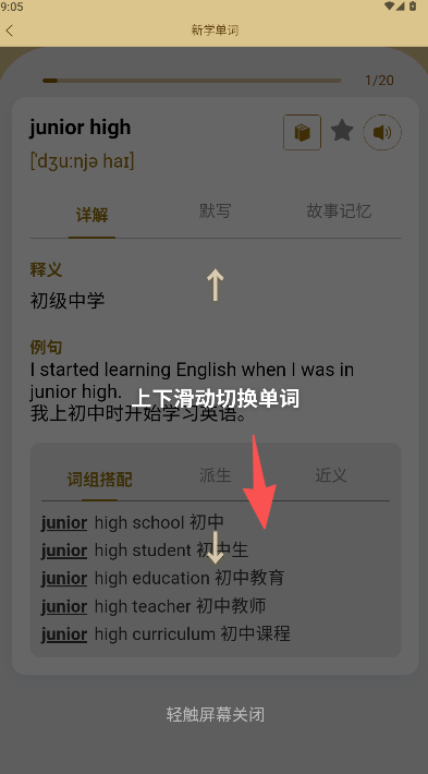 2、在單詞學(xué)習(xí)頁面上下滑動(dòng)切換單詞卡片。