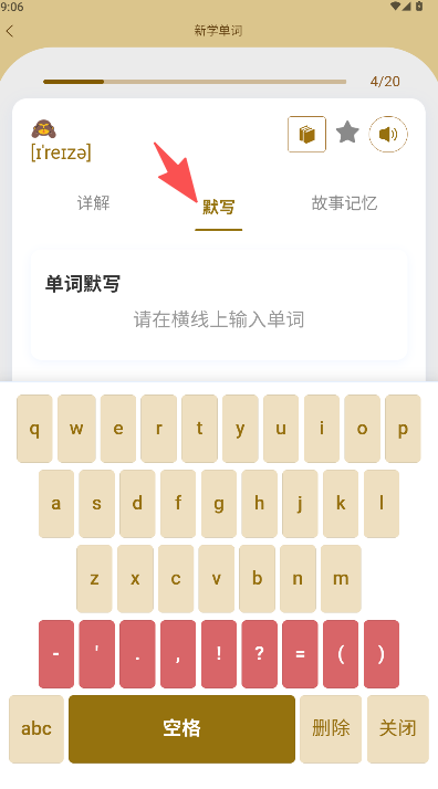 3、進(jìn)入默寫功能明確指示單詞輸入?yún)^(qū)域,引導(dǎo)完成拼寫練習(xí)。