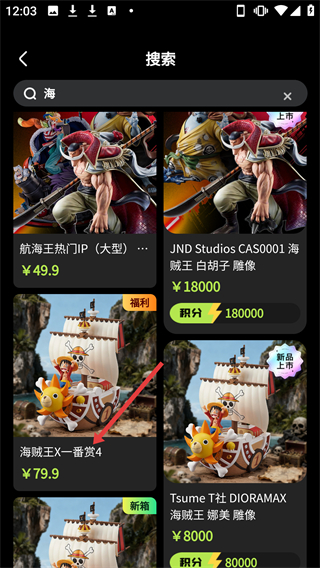 3、在【搜索】頁面輸入內(nèi)容后,會(huì)顯示相關(guān)商品,比如【海賊王X一番賞4】。