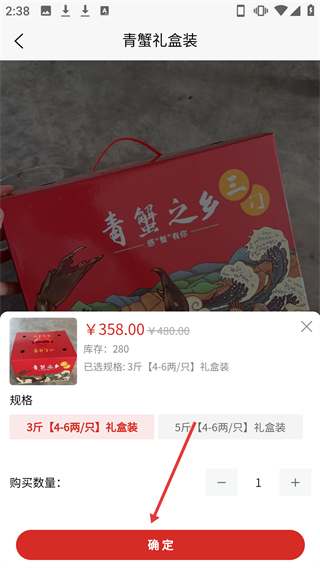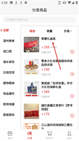 2、在【分類商品】頁(yè)面找到【青蟹禮盒裝】商品,點(diǎn)擊進(jìn)入其詳情頁(yè)。
