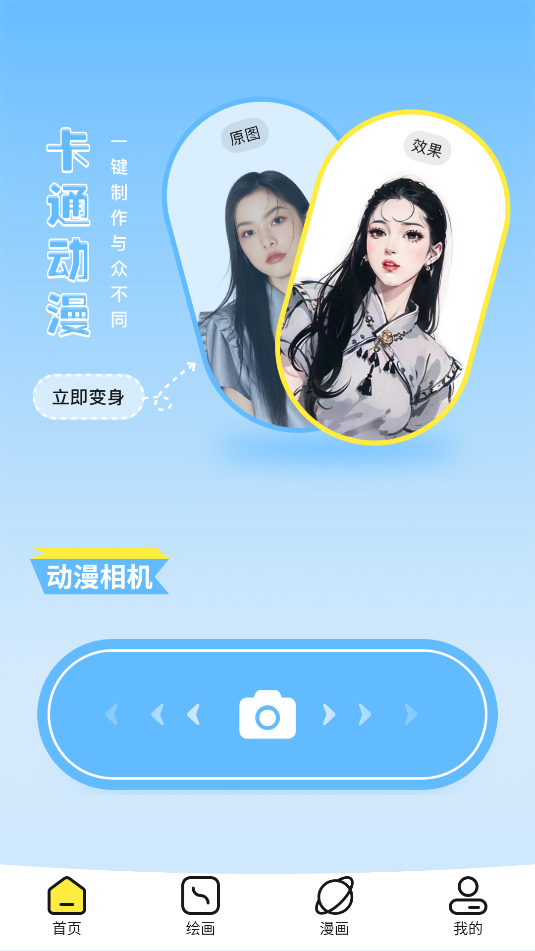 1、打開APP,在首頁中,點(diǎn)擊拍自己的照片,可立即變身為漫畫圖片。