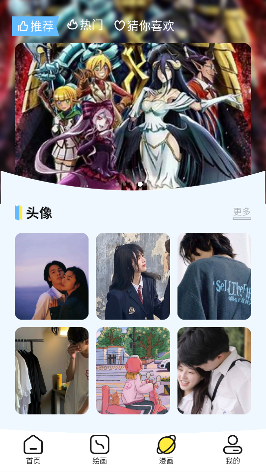 3、漫畫頁面,可點(diǎn)擊上方的漫畫進(jìn)入觀看,點(diǎn)擊下方的頭像可以編輯喜歡的頭像。