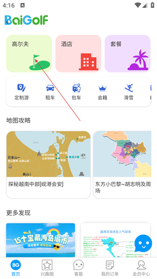 1、在首頁點(diǎn)擊【高爾夫】選項(xiàng),進(jìn)入高爾夫球場搜索界面。