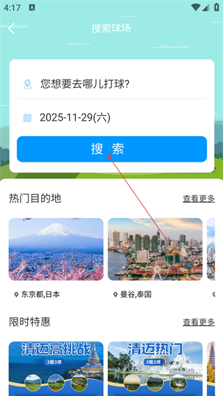 2、在搜索界面填寫打球地點(diǎn)與日期,點(diǎn)擊【搜索】獲取球場列表。